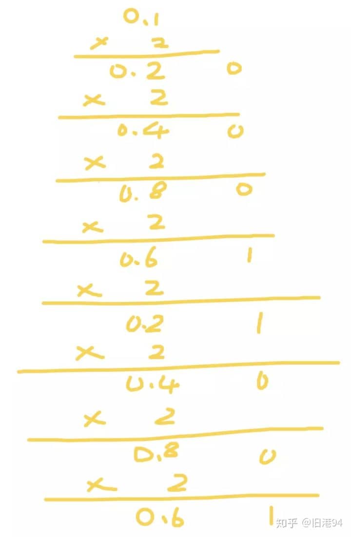 // (0011) 表示循环 0.1 = 2^-4 * 1.10011(0011) 那么如何得到这个二进制的呢,我们可以来演算下